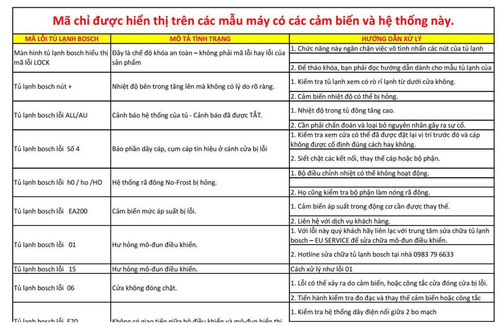 Vì vậy, khi các biểu tượng lạ xuất hiện trên màn hình thay vì nhiệt độ, chủ nhân không còn nơi nào để tìm kiếm thông tin đáng tin cậy và việc gọi thợ sửa tủ lạnh sẽ dễ dàng hơn. Chúng tôi cũng chỉ cung cấp mã lỗi cho tủ lạnh Bosch nhằm mục đích cung cấp thông tin để quý khách hàng có thể nắm rõ được tình trạng lỗi của sản phẩm, hoặc có thể tự kiểm tra được vài lỗi cơ bản, đơn giản.