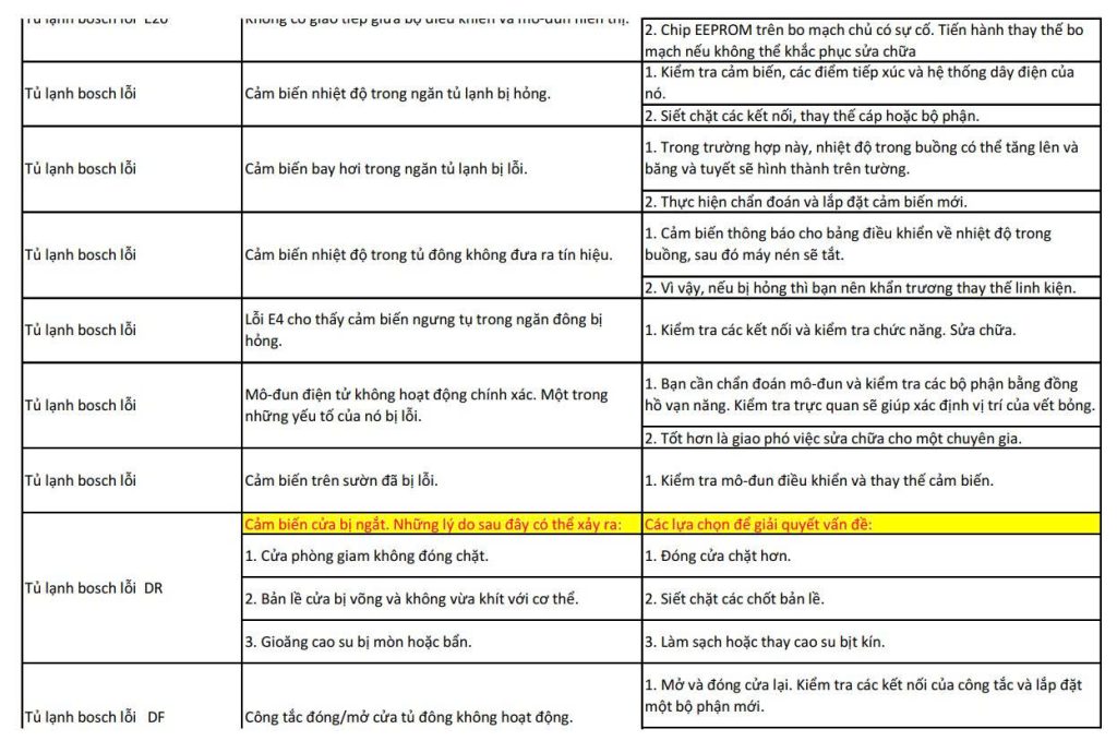 Mã lỗi tủ lạnh bosch thường gặp trong thực tế